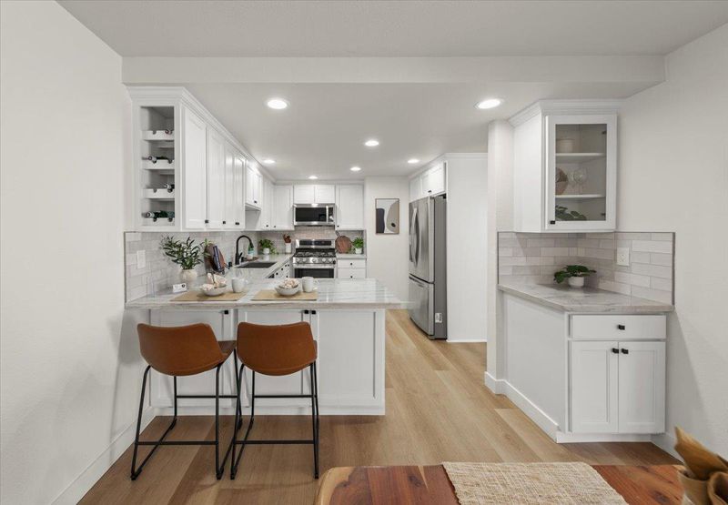 - Cooktop - Gas, Countertop - Quartz, Dishwasher, Garbage Disposal, Microwave, Oven Range, Pantry, Refrigerator