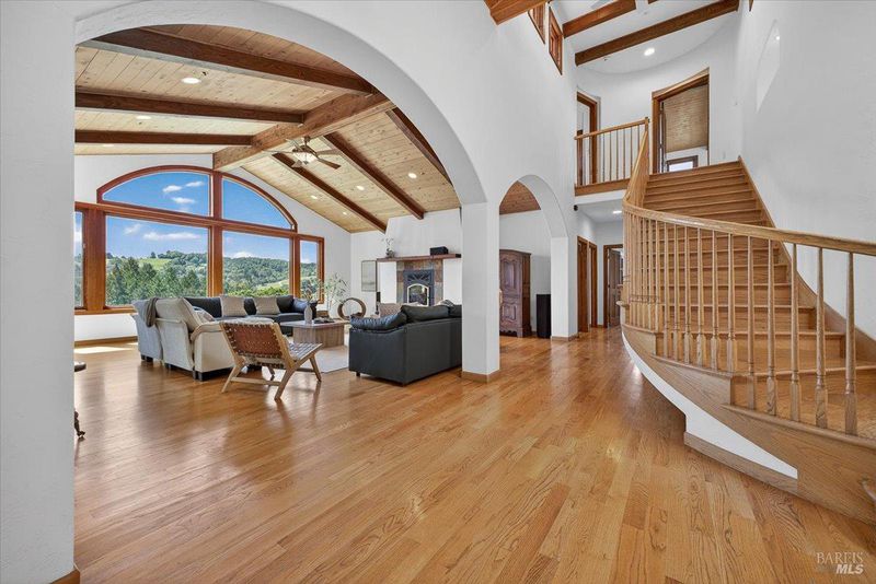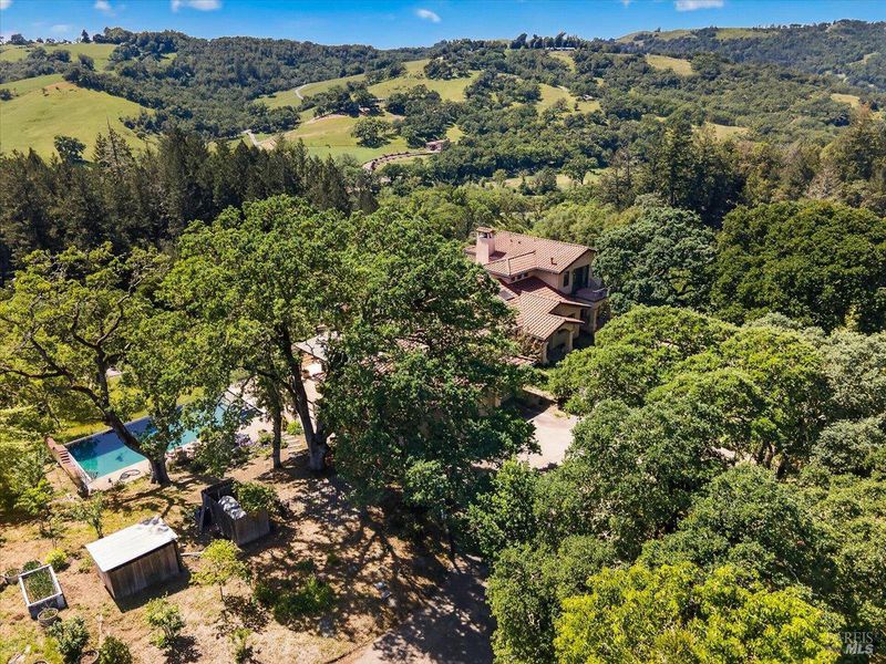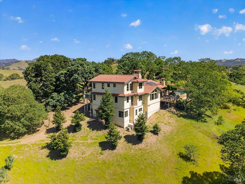 Flora Ranch Estate sits on 40+ acres atop a gentle vineyard knoll with a beautiful custom-built Mediterranean inspired home overlooking Alexander Valley, Mt Saint Helena and Chalk Hill with breathtaking panoramic views. Inside the home, warm, inviting spaces feature soaring beam-wrapped cathedral ceilings, an open-concept layout, and serene seating areas throughout to relax amongst the views. Step onto the wrap-around back deck and enjoy the infinity-edge pool and spa, seamlessly blending indoor-outdoor living. The home's lower level reveals a winemaking lounge, small production studio and wine cellar built into the hillside for aging your own estate grown Cabernet Sauvignon. The vineyard is currently sustainably farmed on 15 acres of hillside in ancient volcanic soils. The gentle rolling topography enhances both vineyard character and breathtaking views. Flora Ranch Estate offers a rare opportunity to join, expand or reimagine within Alexander Valley's esteemed wine growing and agricultural community. The rich land is not only planted to award winning grapes but you'll also find flowers, raised garden beds, an irrigated fruit orchard and a picturesque pond draped with large willow trees. Enjoy the peacefulness of gorgeous country living yet just 15 minutes to Healdsburg Plaza, 15 min to Santa Rosa Airport, 20 min to Napa Valley's Calistoga and within district to the highly sought after Alexander Valley School with bus route at the bottom of Flora Ranch Rd. Generational legacy estates like these don't become available very often and your time has come to make this stunning slice of wine country yours at Flora Ranch Estate.
