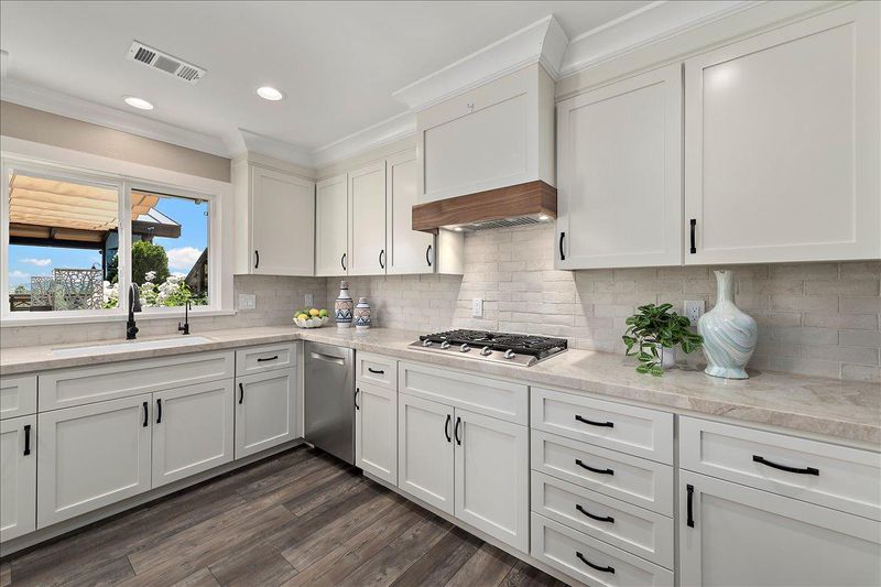 - Cooktop - Gas, Countertop - Quartz, Dishwasher, Exhaust Fan, Garbage Disposal, Hood Over Range, Island, Microwave, Oven - Built-In, Oven - Double, Pantry