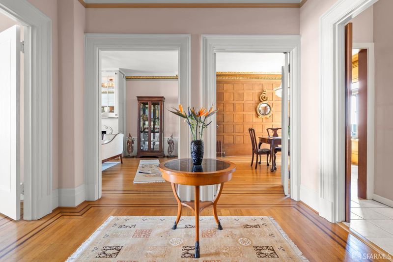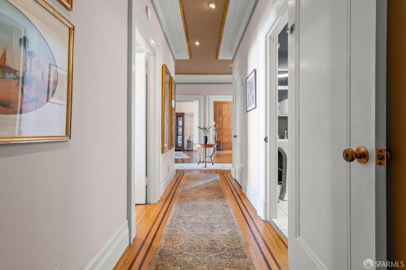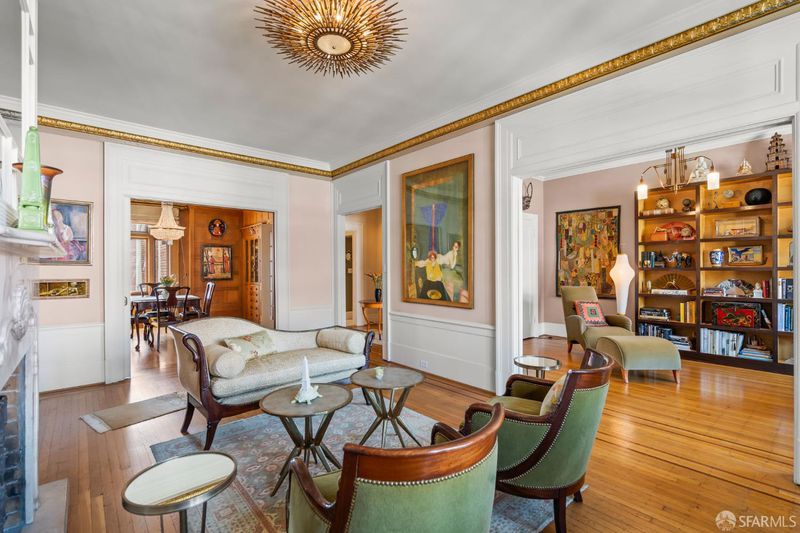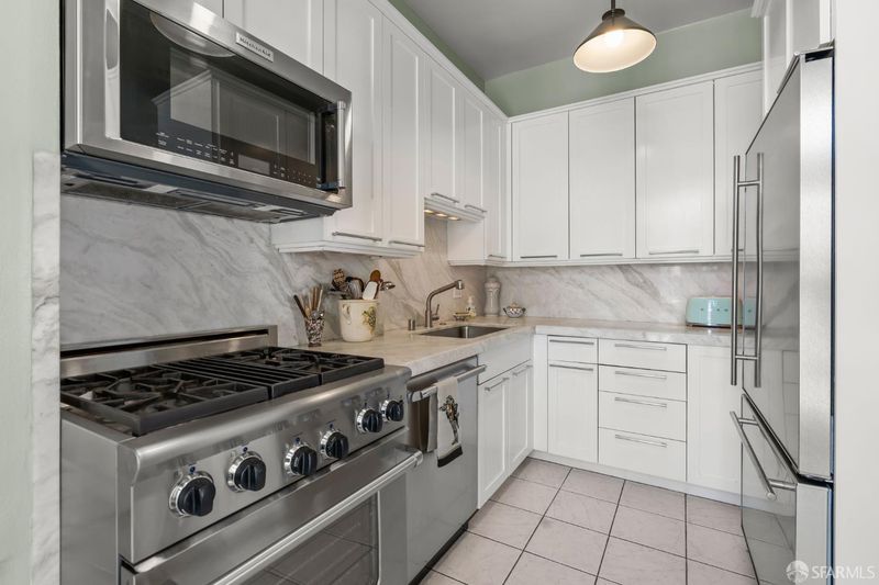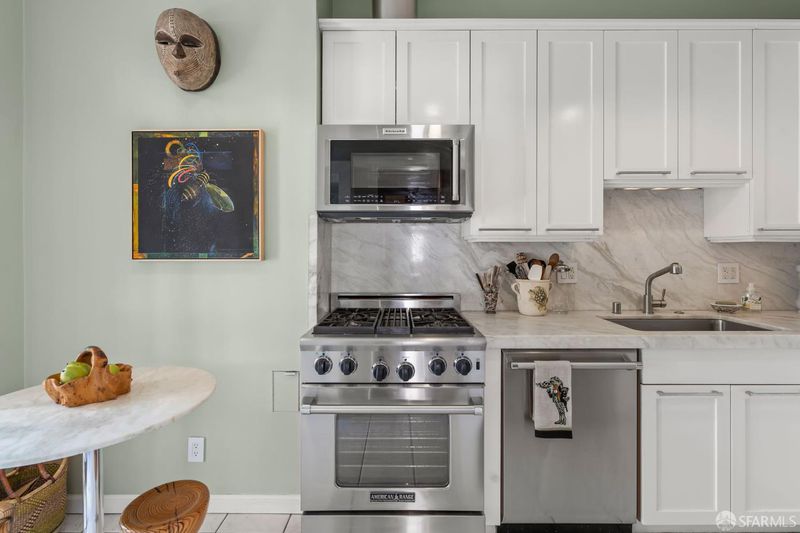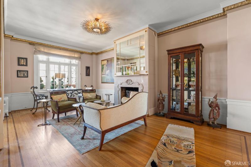 Perched atop a classic pre-war building in the heart of Lower Nob Hill, Residence 602 is a rare and distinguished penthouse offering—an exceptional top-floor corner unit that seamlessly blends historic character with curated modern upgrades. As the only residence in the building with its own fireplace, this home holds a unique place in the property’s architectural story. The building itself reflects the enduring craftsmanship of early 20th-century San Francisco design, where attention to detail and quality materials were paramount. Public spaces in the building are adorned with exquisite crown moldings enhanced by 22-karat gold leaf—an elegant and uncommon refinement that speaks to the building’s pedigree and timeless appeal. Inside, the residence continues this narrative of elevated living with ornate crown molding with 22-karot gold leafing in the main rooms and a period paneled dining room with exquisite detail to craftsmanship. The thoughtfully designed kitchen is both functional and striking, anchored by a commercial-grade four-burner gas stove and complemented by Alba Chiara marble surfaces that extend across the countertops and breakfast table.
