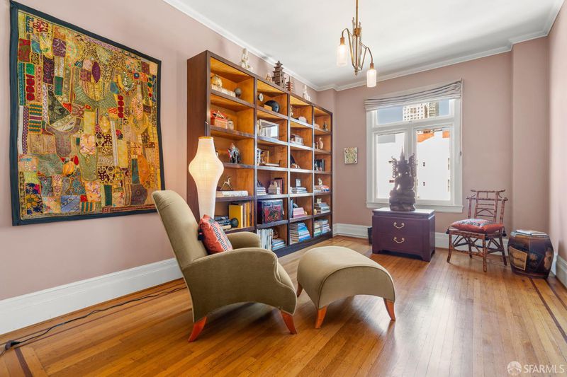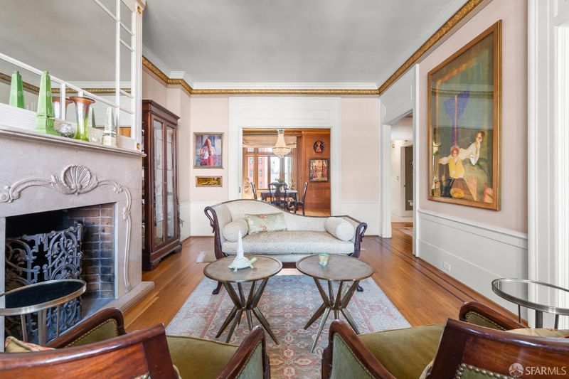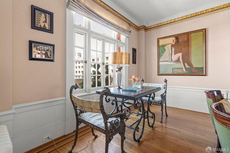 Perched atop a classic pre-war building in the heart of Lower Nob Hill, Residence 602 is a rare and distinguished penthouse offeringan exceptional top-floor corner unit that seamlessly blends historic character with curated modern upgrades. As the only residence in the building with its own fireplace, this home holds a unique place in the property's architectural story. The building itself reflects the enduring craftsmanship of early 20th-century San Francisco design, where attention to detail and quality materials were paramount. Public spaces in the building are adorned with exquisite crown moldings enhanced by 22-karat gold leafan elegant and uncommon refinement that speaks to the building's pedigree and timeless appeal. Inside, the residence continues this narrative of elevated living with ornate crown molding with 22-karot gold leafing in the main rooms and a period paneled dining room with exquisite detail to craftsmanship. The thoughtfully designed kitchen is both functional and striking, anchored by a commercial-grade four-burner gas stove and complemented by Alba Chiara marble surfaces that extend across the countertops and breakfast tablecreating a cohesive and luxurious culinary environment. A charming breakfast area, framed by French doors, invites morning light and offers an intimate setting for dining or quiet retreat. Modern conveniences have been seamlessly integrated, including a new convection microwave system vented directly to the roofan uncommon and highly desirable feature in city living. With two bedrooms and one-and-a-half baths, this penthouse residence offers both comfort and flexibility, all while capturing the privacy and light afforded by its premier corner, top-floor positioning. This is more than a homeit is a rare opportunity to own a piece of San Francisco's architectural legacy, elevated with bespoke enhancements and timeless design.