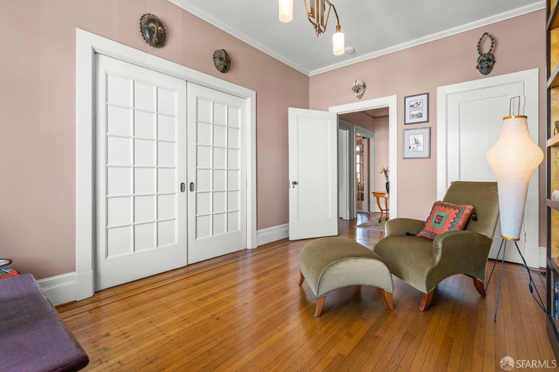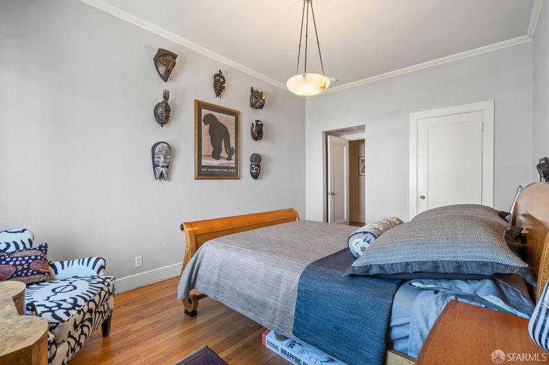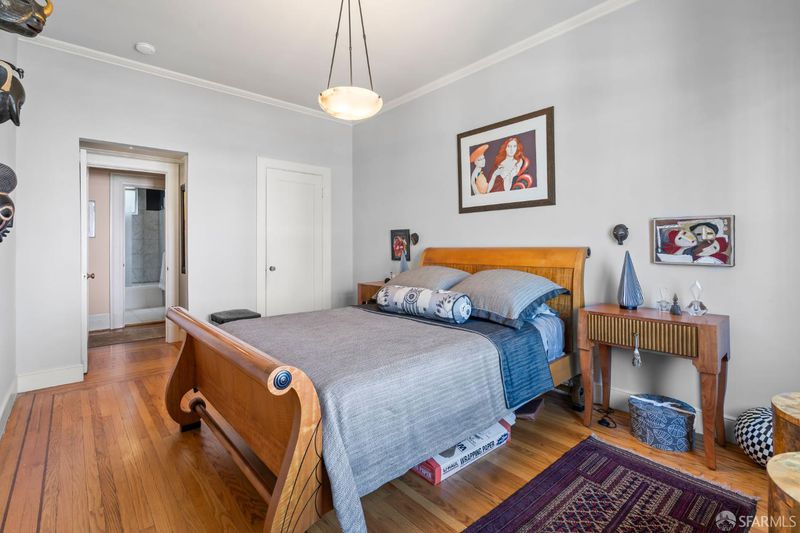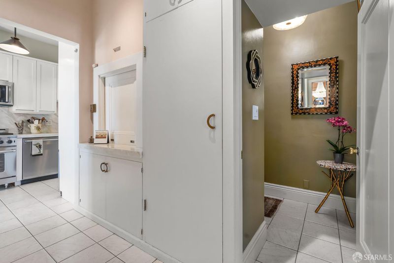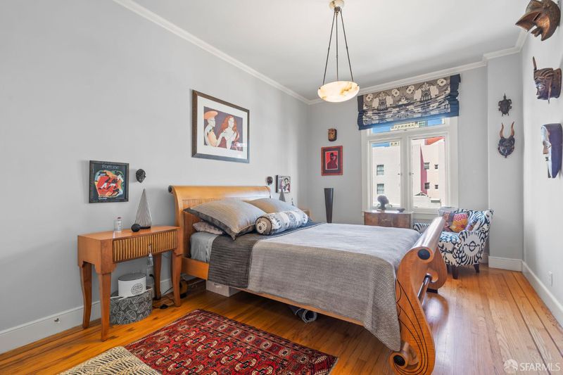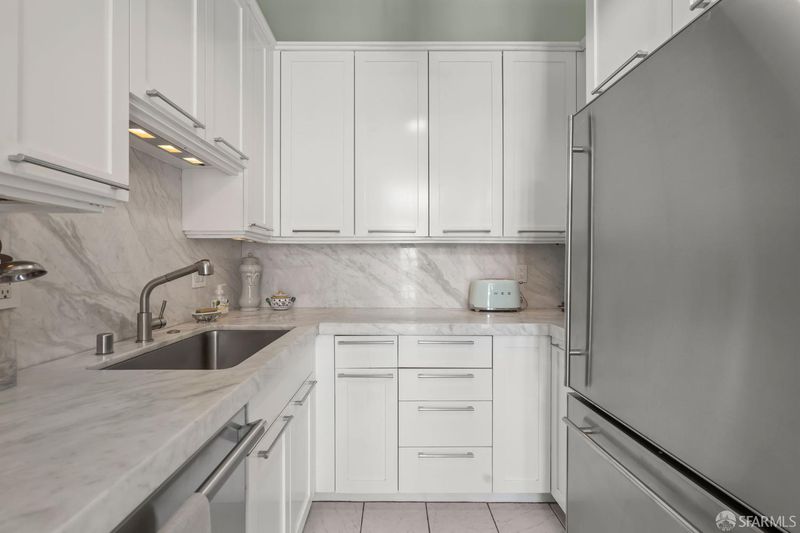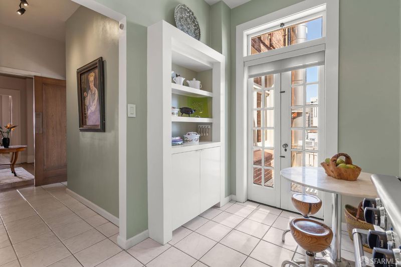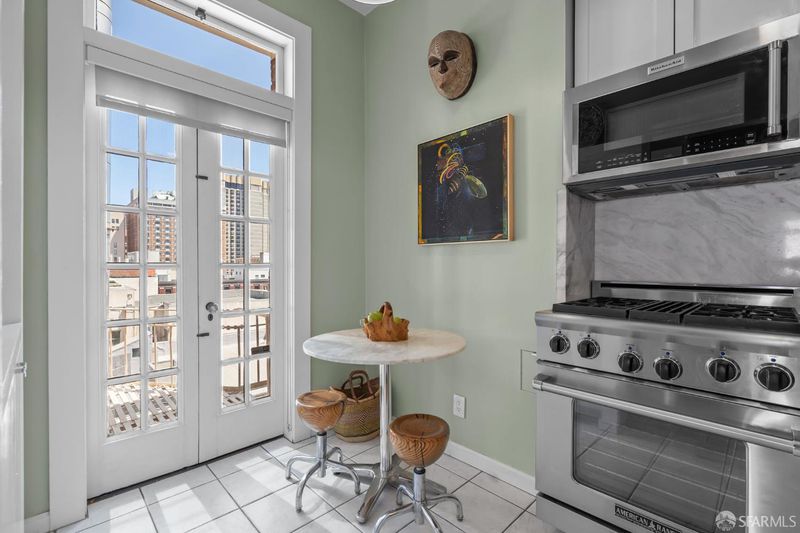 Perched atop a classic pre-war building in the heart of Lower Nob Hill, Residence 602 is a rare and distinguished penthouse offering—an exceptional top-floor corner unit that seamlessly blends historic character with curated modern upgrades. As the only residence in the building with its own fireplace, this home holds a unique place in the property’s architectural story. Inside, the residence continues this narrative of elevated living with ornate crown molding with 22-karat gold leafing in the main rooms and a period paneled dining room with exquisite detail to craftsmanship. The thoughtfully designed kitchen is both functional and striking, anchored by a commercial-grade four-burner gas stove and complemented by Alba Chiara marble surfaces that extend across the countertops and breakfast table—creating a cohesive and luxurious culinary environment. A charming breakfast area, framed by French doors, invites morning light and offers an intimate setting for dining or quiet retreat. Modern conveniences have been seamlessly integrated, including a new convection microwave system vented directly to the roof—an uncommon and highly desirable feature in city living.