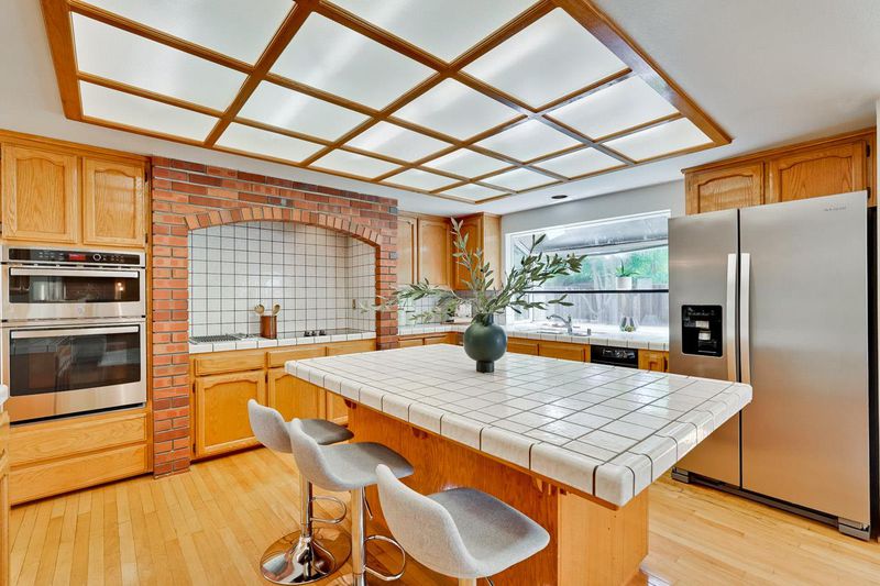 Built-in BBQ Grill, Cooktop - Electric, Countertop - Stone, Countertop - Tile, Dishwasher, Exhaust Fan, Garbage Disposal, Hookups - Gas, Island, Pantry, Refrigerator, Trash Compactor